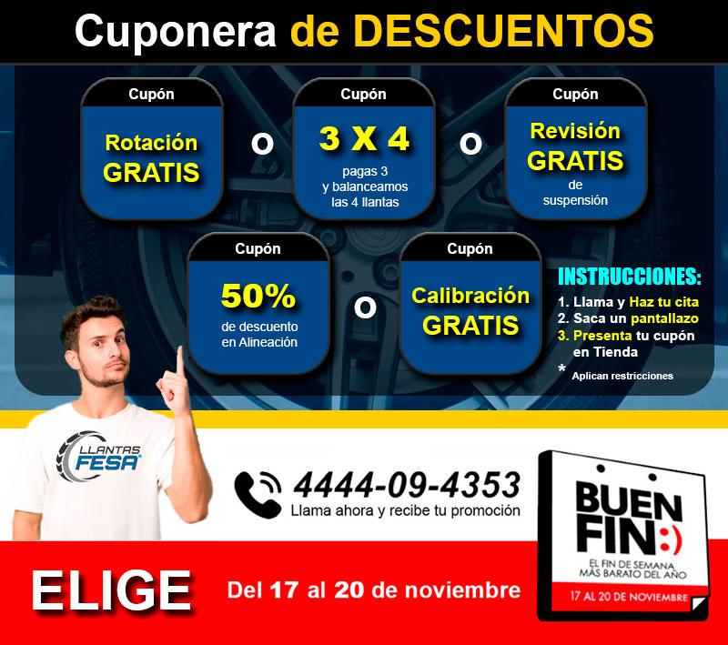 #BuenFin #OfertasAutomotrices #DescuentosEspeciales #LlantasFESA #SeguridadVehicular #DescuentosBuenFin #CuponeraExclusiva